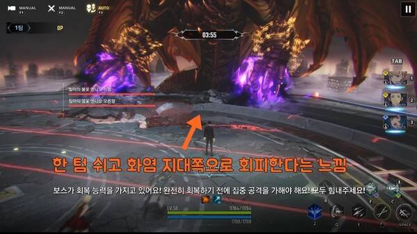 남은 시간 3분 대에 나오는 4번의 브레스는 전부 맞아도 상관 없지만, 마지막 브레스를 피하면 자연스럽게 그림자 밟기로 보스에게 접근할 수 있다.