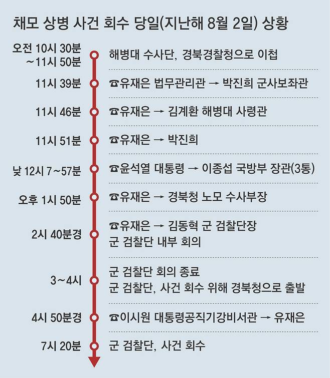 공수처는 이 과정에서 유 관리관이 대통령실과 접촉한 것으로 보고 있다. 공수처는 이날 유 관리관과 이시원 전 대통령공직기강비서관이 통화한 기록을 확보했는데, 당시 군 검찰단은 회의를 마치고 사건을 회수하기 위해 경북청으로 이동하고 있었다. 유 관리관과 이 전 비서관이 통화를 나눈 건 이때가 처음이다. 공수처는 유 관리관과 이 전 비서관이 통화에서 사건 회수를 논의했을 것으로 보고 있다.