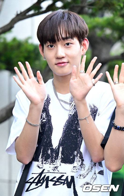그룹 다이몬 민재가 녹화에 들어서며 포즈를 취하고 있다.