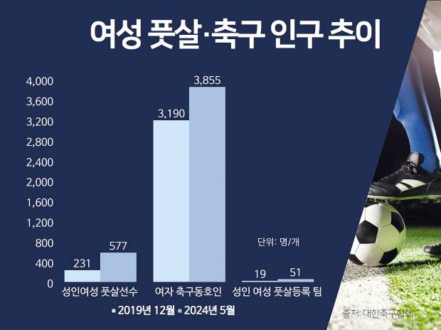 풋살로 좁혀보면 증가세는 더 두드러진다. 협회에 등록된 풋살 성인여성 선수 수는 이달 기준 577명으로 집계됐다. 이는 지난 2019년 12월 231명에 불과했던 것과 비교하면 두 배 넘게 증가한 수치다. 풋살 성인여성 팀도 같은 기간 19개에서 51개로 3배 가까이 늘었다.