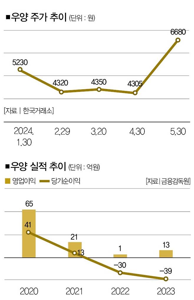 올해 3월 이후 4300~4600원대를 맴돌던 우양의 주가는 지난 5월 17일을 기점으로 상승세로 돌아섰다. 16일 4300원에서 20일 5500원으로 뛰어오르더니 24일엔 장중 7510원까지 치솟았다. 지난 27일 주가는 6910원을 기록했다. 열흘 만에 주가가 60.6%(4300원→6910원) 상승한 셈이다.