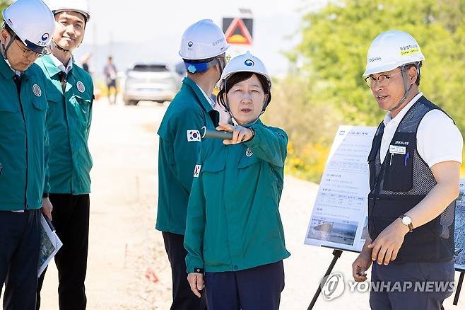 (서울=연합뉴스) 한화진 환경부 장관이 31일 충남 논산시 일원 '금강 우곤제 및 논산천 성동제' 수해복구 공사 현장을 찾아 진행상황을 점검하고 있다. 2024.5.31 [환경부 제공. 재판매 및 DB 금지]