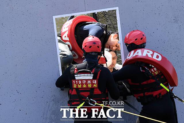 [더팩트ㅣ임영무 기자] 2024 강남구 안전한국훈련이 31일 오후 서울 송파구 탄천공영주차장에서 열린 가운데 소방구조대가 강남역 침수 상황을 가정한 인명구조 훈련을 하고 있다.