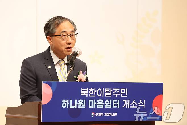(서울=뉴스1) = 문승현 통일부 차관이 31일 강원 화천군 제2하나원에서 열린 북한이탈주민의 마음 건강을 위한 '하나원 마음쉼터' 개소식에서 축사하고 있다.