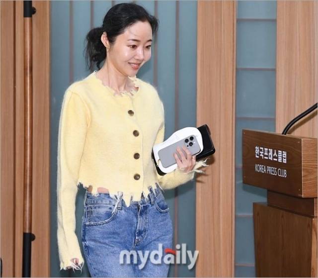 ▲ 데님에 옐로우 재킷을 입고 참석하는 민희진.