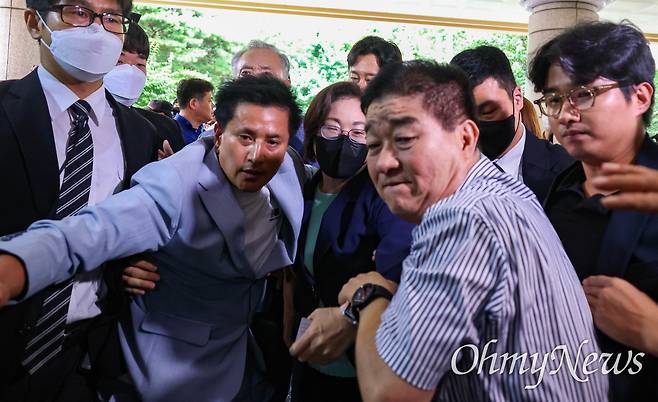 | ▲ 이태원참사 부실 대응 혐의로 구속 된 후 보석 석방된 박희영 용산구청장이 지난 2023년 7월 17일 오전 마포구 서부지방법원에서 열리는 공판에 출석하고 있다. 지지자라고 밝힌 이들이 박희영 구청장을 에워싼 채 급히 법원으로 들어가고 있다. |
