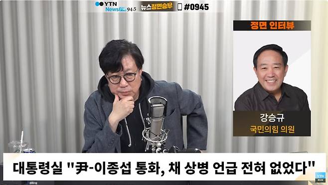 ◆ 강승규: 대통령의 리더십은 그동안 많이 그렇게 드러나지 않았나요? 수시로 전화하고 아침 새벽부터 밤늦게까지 저희 수석이라든지 또 일부 비서관까지도 또 장관들에게는 수시로 통화하시는 분이고요. 본인이 어떤 정책이나 현안이나 뉴스를 보고 분명히 의견을 표현해서 참모들에 또는 내각에 그런 의견들을 듣는 분이기 때문에 전화를 세 번 하고 그랬다는 부분 등이 뭐 채상병건과 연관돼 있다고 이렇게 단정하는 것은 그렇게 보는 것은 적절하지 않고요. 대통령께서는 어떤 부분에서 사안을 굉장히 깊게 또 참모들과 직접 통화하시는 그런 스타일이세요.
