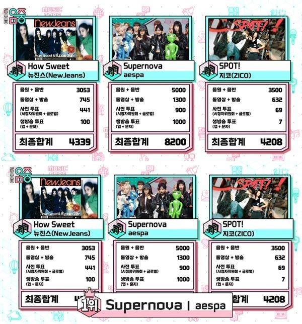 1일 방송된 MBC 음악프로그램 '쇼 음악중심' 6월 첫째 주 1위 후보에는 뉴진스의 'How Sweet', 에스파의 'Supernova', 지코의 'SPOT! (feat. JENNIE)'가 이름을 올렸다.