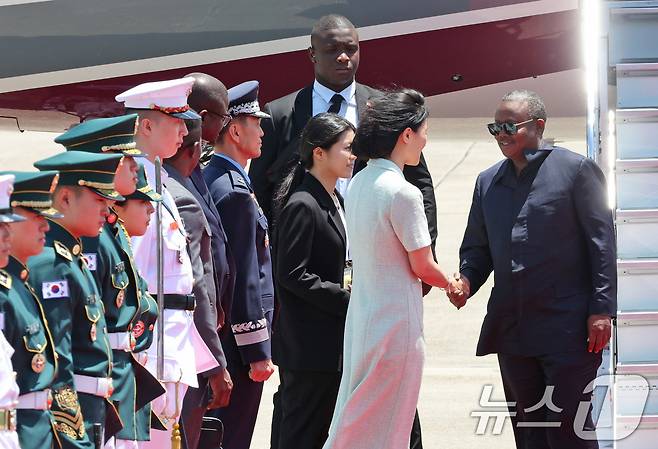 (성남=뉴스1) 장수영 기자 = 우마로 시소코 엠발로(Umaro Sissoco Embalo) 기니비사우 대통령이 2일 오전 경기 성남시 서울공항을 통해 방한하며 김효은 외교부 기후변화대사와 인사하고 있다.