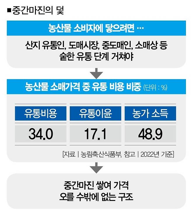 유통과정에서 마진이 붙는 건 당연하지만, 농가보다 중간상인이 더 많은 이익을 보는 구조를 납득하는 건 쉽지 않다. 많은 농산물의 가격에도 이같은 '중간마진'이 붙고, 그 규모는 꾸준히 커지고 있다. 2001년 농산물 가격의 43.7%였던 유통비용 비중은 2020년 49.7%로 증가했다.