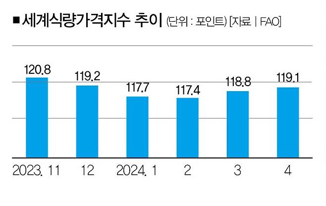 그런데 한가지 아이러니한 게 있다. 원유 생산비에 가장 큰 비중(59.5%•2022년 기준)을 차지하는 사룟값은 안정세를 보이고 있다는 점이다. 유엔식량농업기구(FAO)가 발표하는 세계식량가격지수를 살펴보자. 올해 4월 세계식량가격지수는 3월보다 0.3% 상승한 119.1포인트를 기록했다.