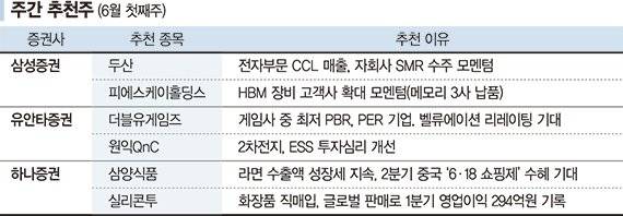 2일 삼성증권은 주간 추천 종목으로 삼성전자, SK하이닉스, 현대차, 기아를 비롯해 HMM, LS ELECTRIC, 한화솔루션, 두산, 에이피알, 피에스케이홀딩스를 제시했다. 이중 포트폴리오에 새로 편입된 두산과 피에스케이홀딩스는 각각 상승 모멘텀이 명확하다는 분석이다.