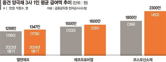 2일 업계에 따르면 에코프로비엠, 엘앤에프, 코스모신소재 3사의 직원들이 받는 올해 1·4분기 급여액은 1년 전과 비교해 일제히 상승했다.