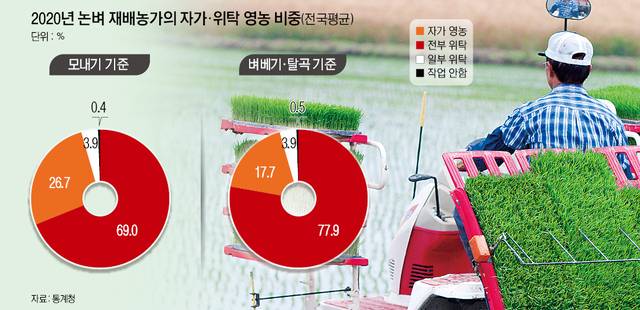 농작업 위탁은 농촌에서 필수가 됐다. 통계청 ‘농림어업총조사’에 따르면 2020년 기준 논벼 재배농가의 절반 이상이 농작업을 위탁하고 있다. 특히 소규모·고령 농가는 고가의 농기계를 살 수 없는 만큼 위탁에 주로 의존한다. 경지면적별로 모내기 작업의 위탁 여부를 묻는 조사에서 0.1㏊ 이상∼0.5㏊ 미만(78.8%), 0.1㏊ 미만(75.8%) 경지에서 ‘전부 위탁한다’는 응답이 가장 많았다. 경영주 연령별로는 80세 이상(83.8%), 75세 이상∼79세 이하(78.5%)에서 전부 위탁한다는 농가가 많았다.