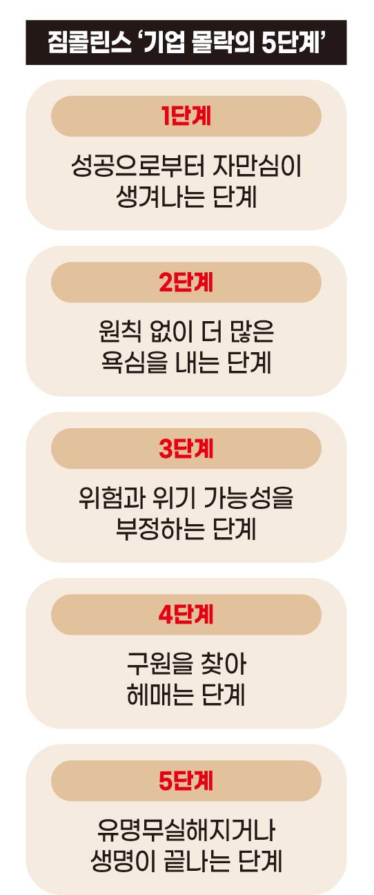 기업이 위기를 맞는 공식은 글로벌 기업도 다르지 않다. ①일등이 이룬 성공 방정식에 집착했고 ②시장 변화에 대응하지 못했다. ③민첩성은 떨어지고 리더십은 경직됐다. ④과도한 부채와 무리한 투자로 재무 부담은 늘어나고 ⑤혁신적 리더십이 실종된 와중에 아래에서의 팔로어십은 붕괴한다.
