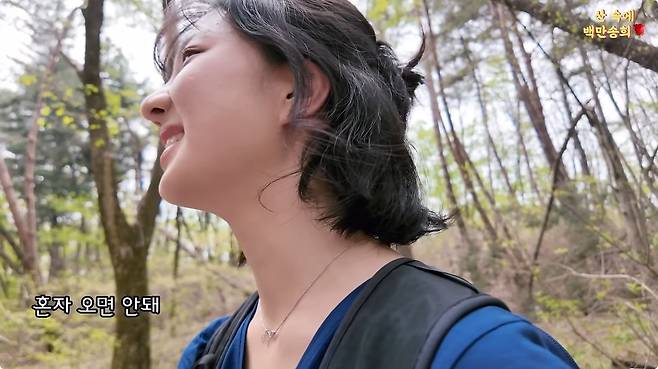 | ▲ 4월 말 올라온 '산 속에 백만송희' 유튜브 영상 중 화면갈무리. 혼자 등산하다가 위험하다는 이유로 다른 중년 여성에게 걱정어린 훈계를 듣는 장면. |