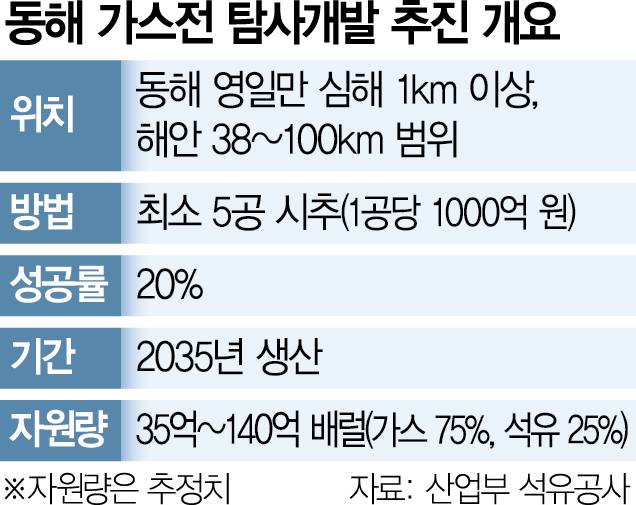 정부가 석유와 가스 발견 가능성을 공식화한 동해 심해 가스전은 경북 포항 영일만에서 38~100㎞ 떨어진 넓은 범위의 해역에 걸쳐 있다. 동해 가스전보다는 북쪽 해역에 위치해 있지만 모두 한국의 독자 배타적경제수역(EEZ)에 포함돼 주변국과 분쟁 가능성은 거의 없는 편이다. 해수면 1㎞ 이상 아래 깊은 바닷속에 있어 탐사 및 개발 난도가 높다. 자원 업계의 한 고위 관계자는 “그동안 탐사가 많이 이뤄지지 않았던 심해”라며 “상당한 기대감이 있다”고 전했다.