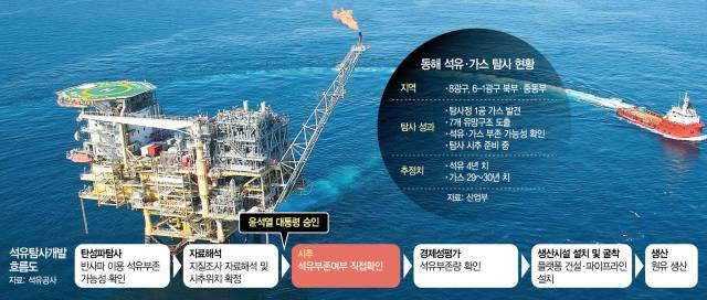 석유·가스 개발은 △물리탐사 자료 취득 △전산 처리 △자료 해석 △유망 구조 도출(석유가 발견될 전망이 있는 구조) △탐사 시추(지하자원을 탐사하기 위해 땅속 깊이 구멍을 파는 작업) △개발·생산 등의 순서로 진행된다. 국내 대륙붕에 대한 탐사권자인 한국석유공사가 이날 윤석열 대통령과 주무관청인 산업부로부터 탐사 시추를 승인받았으니 유망 구조 도출에서 탐사 시추로 접어드는 단계에 해당한다.