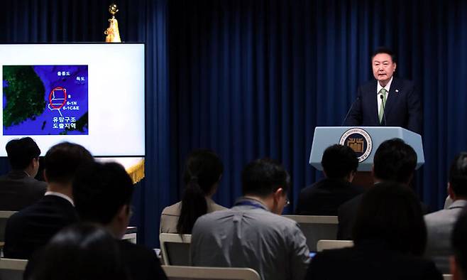 | 국정 브리핑하는 尹 윤석열 대통령이 3일 서울 용산구 대통령실 청사에서 경북 포항 영일만 앞바다에 최대 140억배럴에 달하는 석유·가스전이 존재할 가능성이 높다는 내용의 국정 브리핑을 하고 있다. 대통령실사진기자단 |