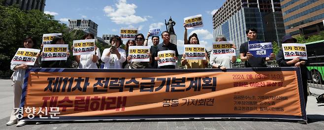 탈핵시민행동 회원들이 3일 서울 광화문광장에서 제11차 전력수급기본계획 실무안 재수립을 촉구하는 기자회견을 하고 있다.