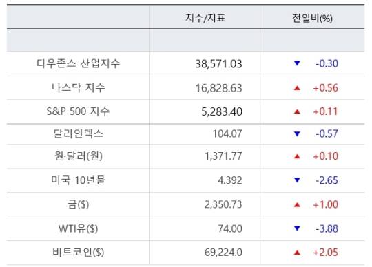스탠더드앤드푸어스(S&P)500지수는 전장보다 5.89포인트(0.11%) 오른 5,283.40을, 나스닥지수는 전장보다 93.65포인트(0.56%) 오른 16,828.67에 거래를 마감했다.