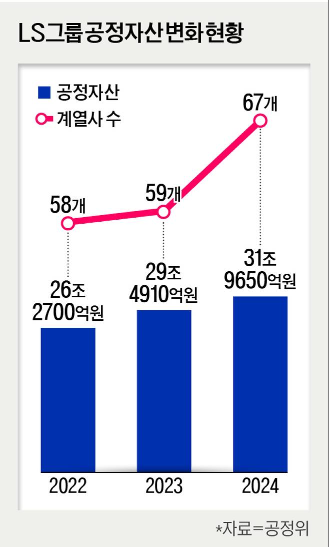 LS의 공정자산은 2022년 26조2700억원, 2023년 29조4910억원에서 증가세가 유지되고 있다. 계열사 수는 2023년 59개에서 67개로 증가하는 등 확장성이 주목을 끌고 있다.