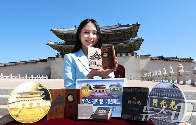 (서울=뉴스1) 구윤성 기자 = 4일 오전 서울 종로구 광화문 월대에서 모델이 '2024 광화문 기념메달'을 선보이고 있다. 2024.6.4/뉴스1