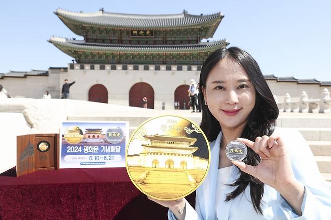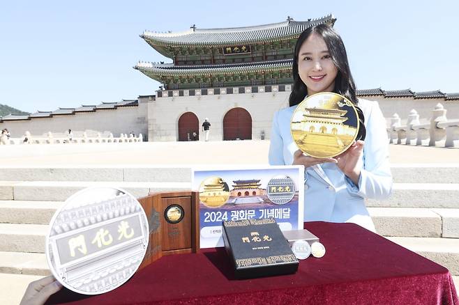 풍산화동양행이 4일 오전 서울 종로구 광화문 월대 앞에서 '2024 광화문 기념메달'을 공개하고 있다.