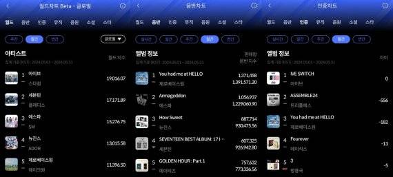 한터차트는 지난 1일 오전 10시에 5월 월간 차트를 공식 발표했다. 발표에 따르면 아이브와 제로베이스원이 한터 5월 월간 월드차트 1위에 이름을 올렸다.