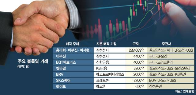 4일 서울경제신문이 전수조사한 집계에 따르면 올 들어 500억 원 이상의 블록딜 거래는 15건이 진행됐다. 매각한 지분 규모만 6조 원에 달한다. 이는 지난해(1조 6000억 원)의 네 배가량이나 된다.