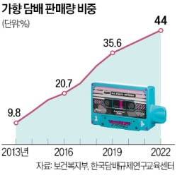 4일 기획재정부에 따르면 지난해 담배 판매량은 37억4300만 갑으로 전년(37억1400만 갑) 대비 0.8% 늘었다. 2년 연속 증가세다. 특히 가향 담배 판매량이 폭발적으로 늘어나고 있다. 2013년 4억2000만 갑이던 가향 담배 판매량(보건복지부 추계)은 2018년 10억 갑을 처음 돌파한 뒤 2022년 16억3000만 갑으로 늘었고 작년에도 더 증가했을 것으로 추산된다. 전체 담배 시장에서 가향 담배 판매 비중은 2013년 9.8%에서 2022년 44%로 네 배 넘게 높아졌다. 질병관리청에 따르면 만 13~39세 흡연자 중 77.2%가 가향 담배를 피우는 것으로 나타났다.