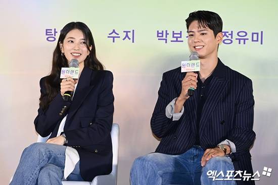 (엑스포츠뉴스 김유진 기자) 영화 '원더랜드'(감독 김태용)를 알리기 위해 열정적으로 다양한 활동을 펼쳐온 수지와 박보검이 작품 속 커플 연기를 향한 호응에 감사 인사를 함께 전했다.