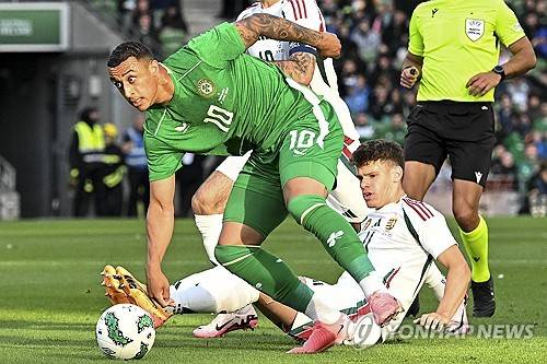 epa11389964 Kerkez Milos (R) of Hungary in action against Adam Idah of Ireland during the international friendly soccer match between Ireland and Hungary in Dublin, Ireland, 04 June 2024. EPA/Tibor Illyes HUNGARY OUT