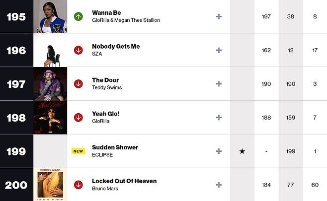 4일(현지시간) 빌보드가 발표한 '빌보드 글로벌 200' 차트에서는 이클립스 명의의 '소나기'가 199위에 이름을 올리며 차트인했다.
