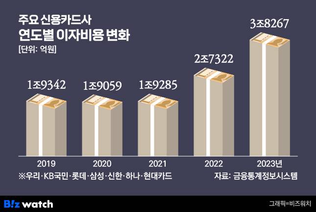 실제 카드업계의 이자 비용은 2022년 이후 급격히 늘었다. 금융감독원 금융통계정보시스템에 따르면 작년 말 기준 7개 전업카드사(신한·KB·삼성·현대·롯데·우리·하나)의 이자비용은 총 3조 8267억원으로 전년 대비 40% 증가했다. 2021년까지만 해도 2조원을 밑돌았는데, 2022년 2조 7322억원을 기록한 데 이어 2년 새 2배 가까이 증가한 것이다.