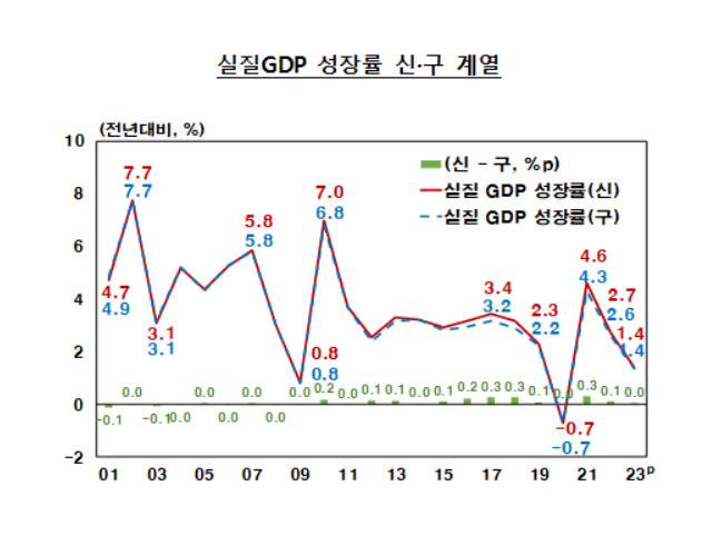 2001~2023년중 실질GDP의 연평균 성장률(신계열)은 3.6%로 구계열 성장률 3.5%에 비해 0.1%포인트 상향 수정됐다. 실질GDP 성장률 신계열의 전반적인 추세는 구계열과 거의 유사하나 2016~20년 성장률이 구계열에 비해 0.2%포인트 상향되면서 생긴 변화다.