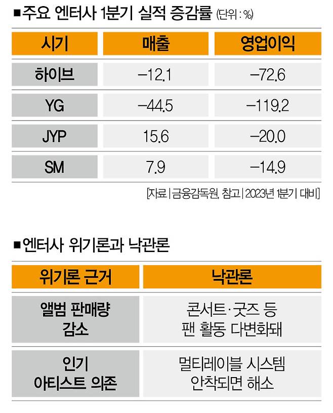 국내 4대 엔터사가 올 1분기 어닝쇼크를 기록했다. 관련 주가는 '떨어지는 칼'을 피하지 못했고, 증권사들은 줄줄이 목표가를 하향조정했다. 그러자 잘나가던 K-팝 산업도 위기론에 휩싸였다. 일부에선 '업황 고점'을 찍었으니 이제 떨어질 일만 남았다는 비관론도 설파한다. K-팝 산업은 정말 위기일까.