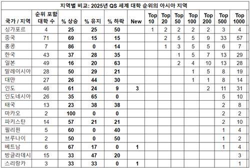 싱가포르는 최근 순위에서 세계 상위 10위에 포함된 유일한 아시아 국가다. 중국이 가장 많은 대학을 순위에 올려 순위권 대학이 10개 이상인 국가/지역 중 순위가 상승한 대학의 비율(69%)이 가장 높았고, 인도가 61%로 그 뒤를 이었다. 반대로 가장 큰 폭으로 하락한 국가는 일본으로, 순위에 포함된 대학의 63%가 10년간 지속적으로 하락 추세를 이어가고 있다. 그럼에도 불구하고 아시아에서 가장 많은 상위 200위권 대학을 보유한 국가는 일본으로 10개이며, 중국이 9개, 한국이 7개로 그 뒤를 잇고 있다. 인도네시아는 순위를 매긴 대학 중 65%가 순위를 유지하고 35%가 향상되는 등 안정성이 돋보였다.