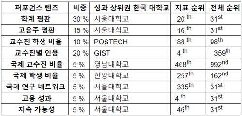 - 포항공과대학은 교원 학생 비율(10%)에서 전국 선두를 차지하며 전체 88위를 기록했다.