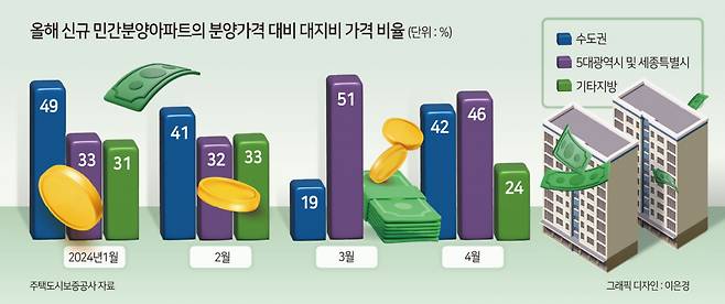 주택도시보증공사(HUG)가 발표하는 민간사업장 분양가 중 대지비 비율을 따져보면, 올해 수도권과 광역시는 평균 대지비 비중이 30~40%를 웃돌지만 기타지방은 20% 선에 머물고 있다.