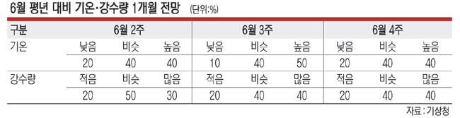 기상청은 5일 ‘1개월 전망’(6월 10일~7월 7일)을 통해 이달 둘째 주 평균 기온이 평년과 비슷하거나 높을 가능성을 80%로 예상했다. 3·4주에는 그 가능성이 각각 90%, 80%로 나타났다. 강수량은 2~4주 모두 많거나 비슷할 가능성이 80%였다. 장마가 시작되는 이달 말에는 평년에 비해 강수량이 많을 확률이 40%로, 적을 확률(20%)에 비해 높았다.
