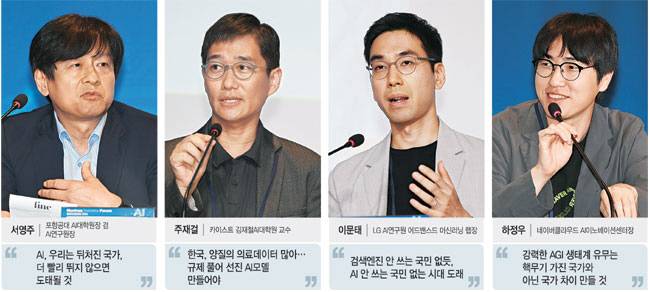 AI 경쟁력을 ‘소버린 AI(AI 주권)’ 개념에 비유하기도 했다. 하 센터장은 “돈이 많은 중동 국가들이 미국이 만든 AI를 쓰지 않고 굳이 자체 기술을 개발하려는 이유는 문화 종속을 우려하기 때문”이라며 “미래 세대들이 미국산 AI의 콘텐츠와 세계관에 익숙해지기 전에 자체 AI 기반을 구축하는 건 곧 AI 주권 확보로 이어진다”고 말했다. 이에 대해 패널 토론에 나선 주재걸 카이스트 김재철AI대학원 교수는 “글로벌 기업이 선보인 AI 모델들은 우리 고유의 문화를 제대로 이해하지 못하는 경우가 많다”며 “독자적인 우리나라의 거대언어모델(LLM)을 발전시키는 게 국가 전체의 과업”이라고 주장했다.