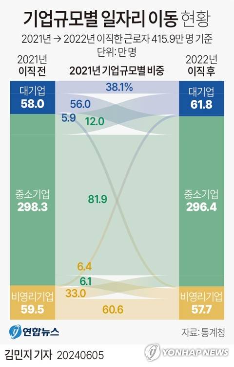 (서울=연합뉴스) 김민지 기자 = 5일 통계청이 발표한 '2022년 일자리 이동통계 결과'에 따르면 2021년에서 2022년으로 이직한 사람들 가운데 중소기업에서 이직한 사람들의 12.0%가 대기업으로 이직한 것으로 나타났다.