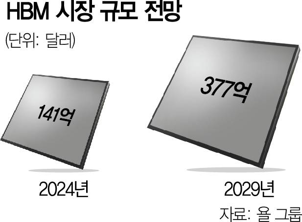 실제로 HBM 시장의 성장세가 가파르다. 업계에 따르면 프랑스의 시장조사 업체 욜그룹은 세계 HBM 시장 규모가 올해 141억 달러(약 19조 원)에서 2029년 377억 달러(약 52조 원)로 성장할 것이라고 전망했다. 특히 인공지능(AI) 기술이 급격히 발전하면서 HBM 수요가 확연히 늘어나는 모습이다. 최근 한국 수출이 메모리반도체를 중심으로 호황을 보이는 것도 HBM 덕분이라는 분석도 나온다.