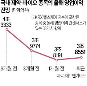 5일 금융정보업체 에프앤가이드에 따르면 올해 실적 컨센서스(증권사 3곳 이상 예상치 평균)가 있는 국내 제약·바이오주 33개의 올해 영업이익 전망치 합계는 3조8551억원으로 집계됐다.
