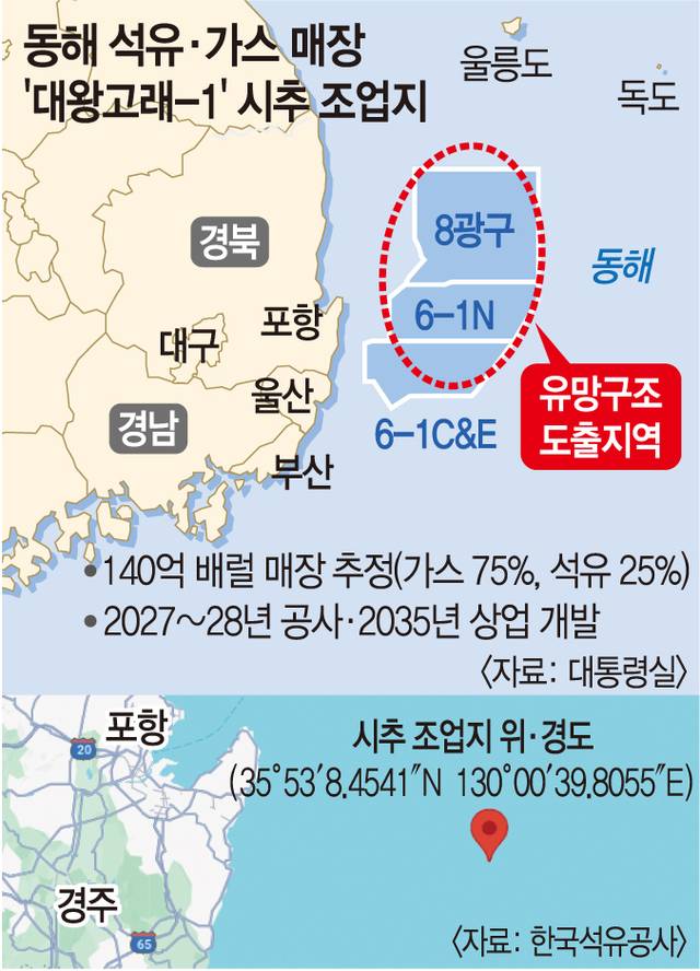 석유공사는 앞서 신규 가스전 발견 가능성이 큰 동해 7개 해역에 각각 ‘대왕고래’ ‘오징어’ ‘명태’ 등과 같은 해양생물 이름을 붙였다. 이 중 대왕고래는 8광구와 6-1광구 북부에서 석유와 가스 매장량이 가장 많을 것으로 추정되는 지역이다.