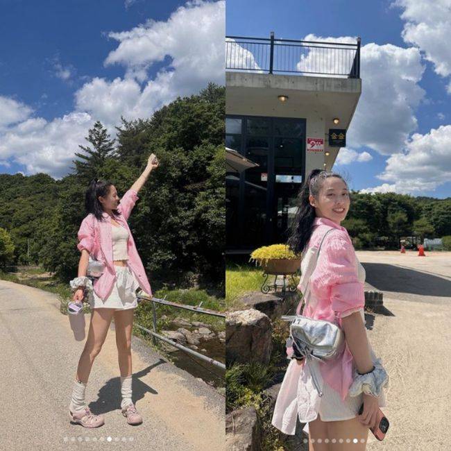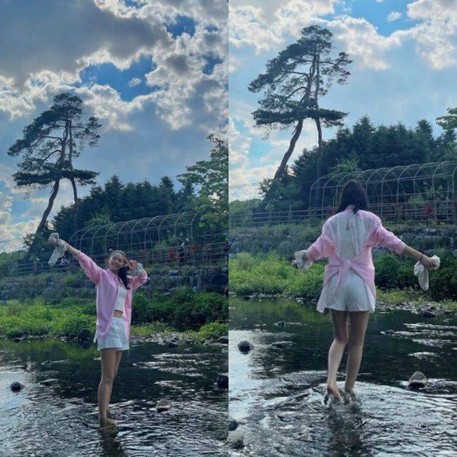 공개된 사진 속 설현은 머리를 높게 묶은 포니테일 헤어스타일에 하얀색 반바지와 크롭티를 입고 핑크색 셔츠를 매치해 캐주얼룩을 완성, 동시에 상큼, 러블리 매력을 뽐냈다. 또한 그는 카메라를 향해 환하게 웃거나 계곡에서 물놀이 하는 등 발랄한 분위기를 자아냈다.