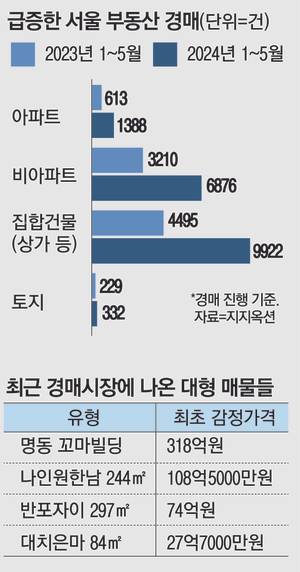 경매정보업체 지지옥션에 따르면 올해 1~5월 서울 아파트 경매 진행건수는 1388건으로 전년 같은 기간(613건)보다 2.3배 늘어났다. 이 기간 비아파트 경매진행은 6876건으로 지난해 동기(3210건) 대비 2.1배 증가했고, 상가를 비롯한 집합건물도 9922건으로 2023년(4495건)보다 2.2배 늘었다. 토지는 332건으로 전년 동기(229건)보다 45% 급증했다. 수도권도 서울과 비슷한 흐름이다.