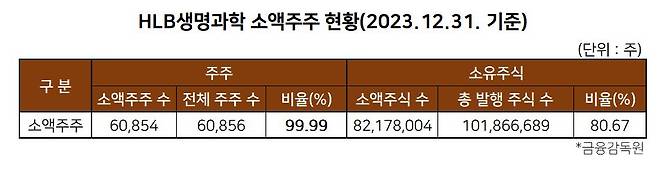 지난해 사업보고서에 따르면 HLB생명과학의 발행주식은 6만여명 주주 가운데 HLB와 관계사인 HLB테라퓨틱스를 제외하면 모두 소액주주에 분산돼 있다. 따라서 이번 유상증자에서도 소액주주 역할이 중요하다.