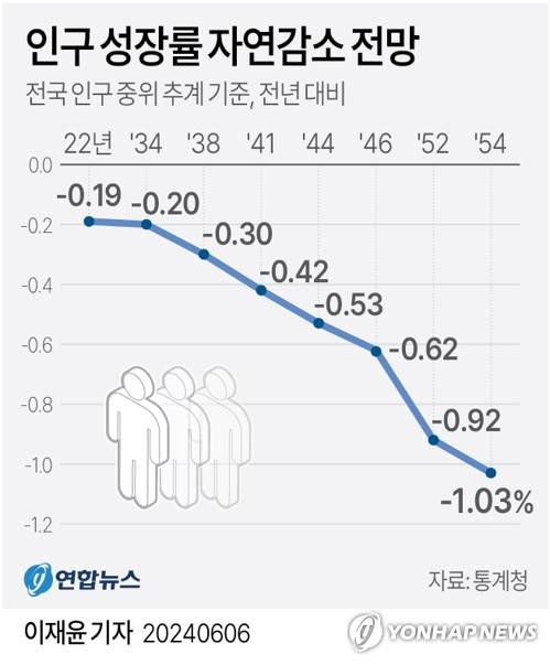 (서울=연합뉴스) 이재윤 기자 = 6일 통계청이 2022년 인구총조사를 기초로 최근 출생·사망·인구이동 추이를 반영해 전망한 장래인구추계에 따르면 2054년 전국 인구는 중위 추계 기준으로 전년보다 1.03% 감소하는 것으로 예측됐다.
